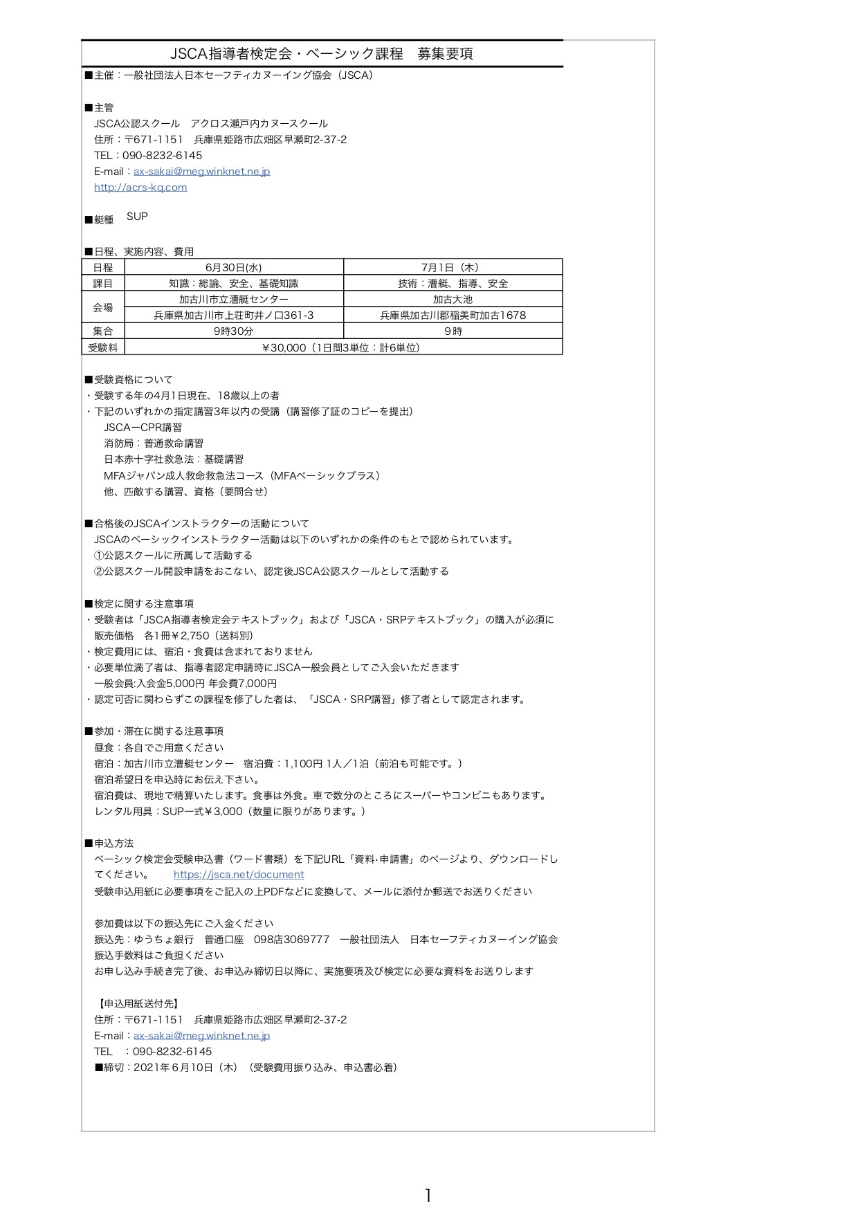 日本セーフティカヌーイング協会(JSCA)のSUPベーシックインストラクターの検定会を行います。